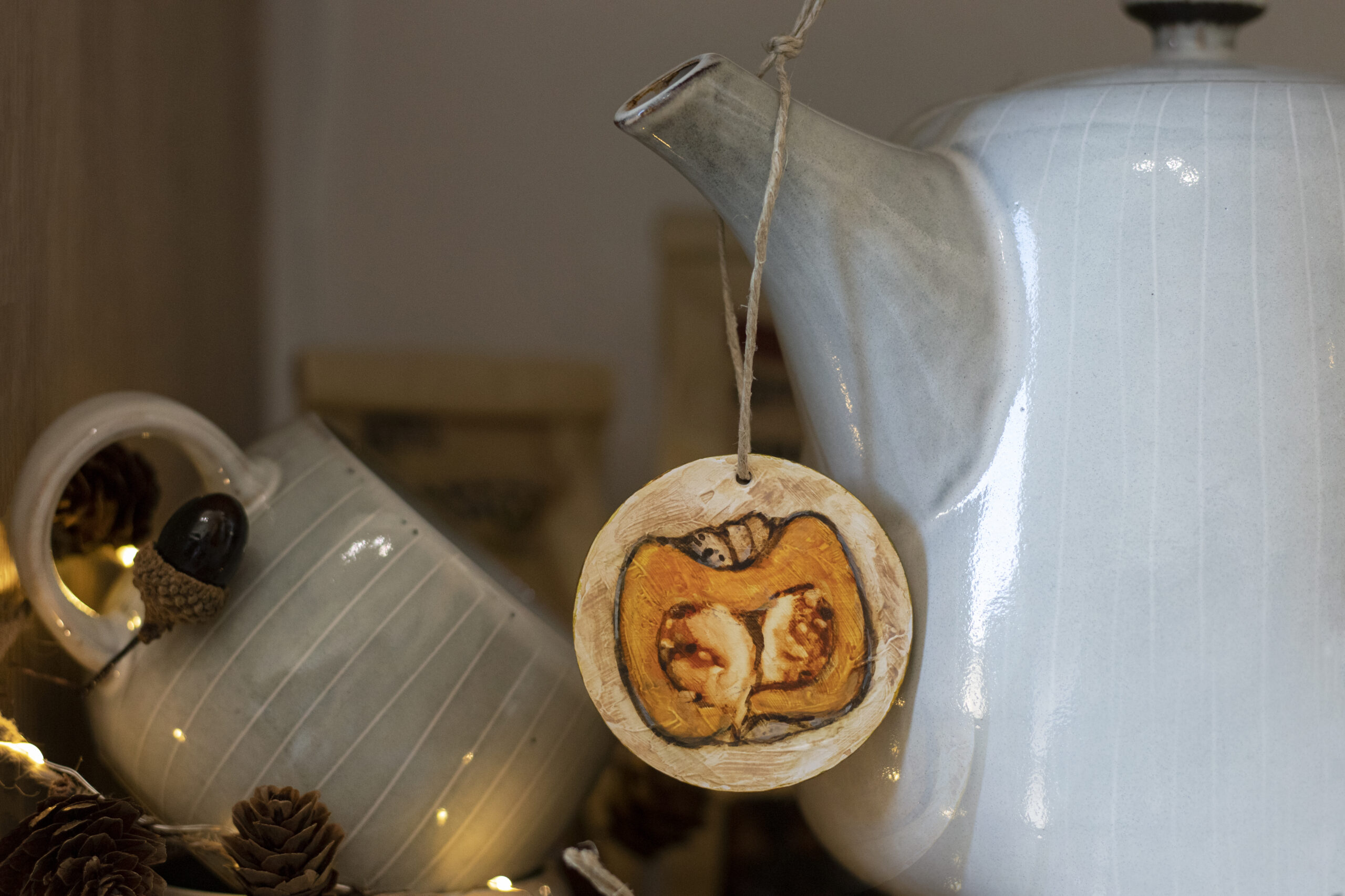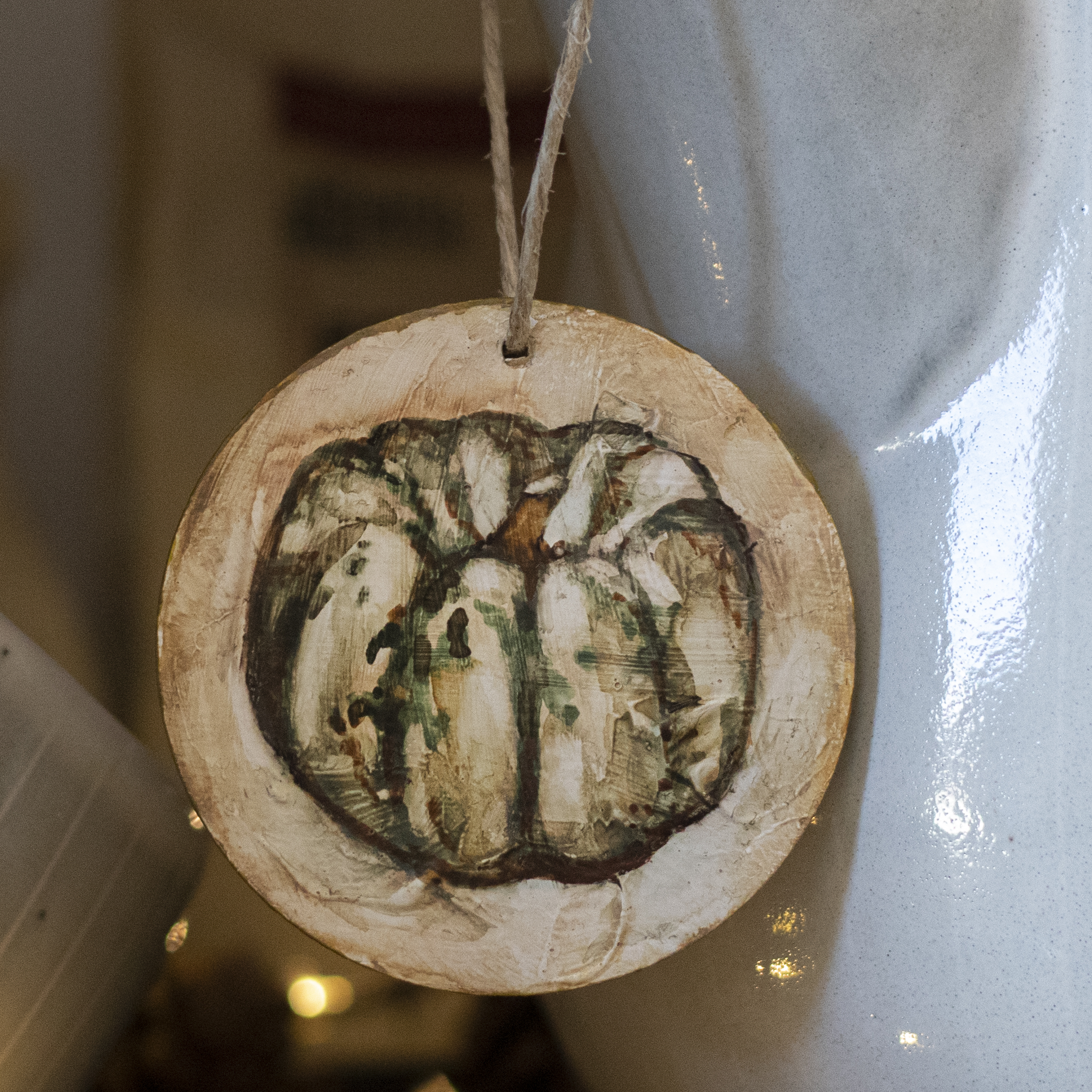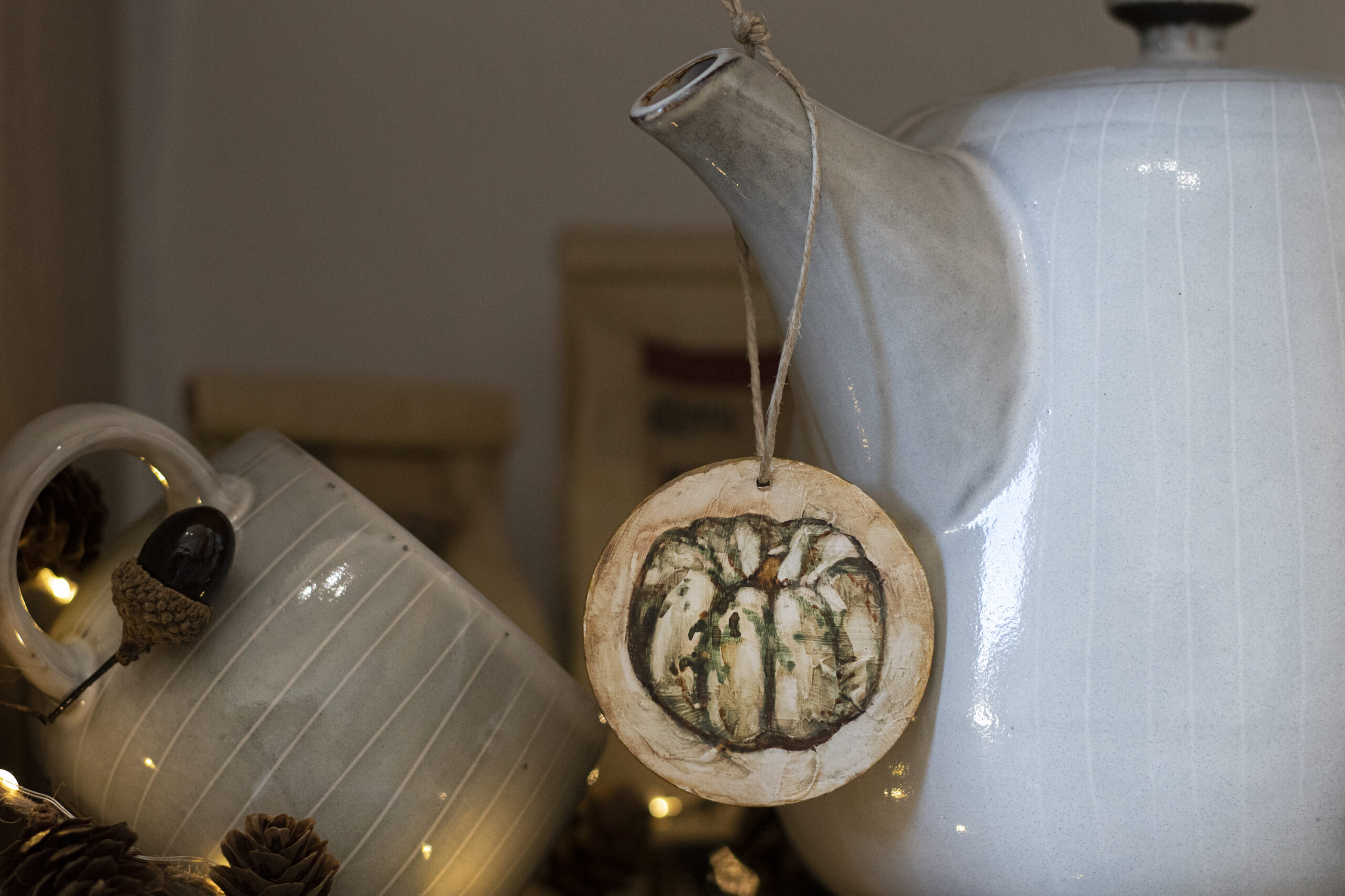 I painted this little pumpkin with watercolors on a round piece of wood. Its colors and shape make it one of a kind, bringing a cozy touch of autumn. Each side is hand-painted with care and love.